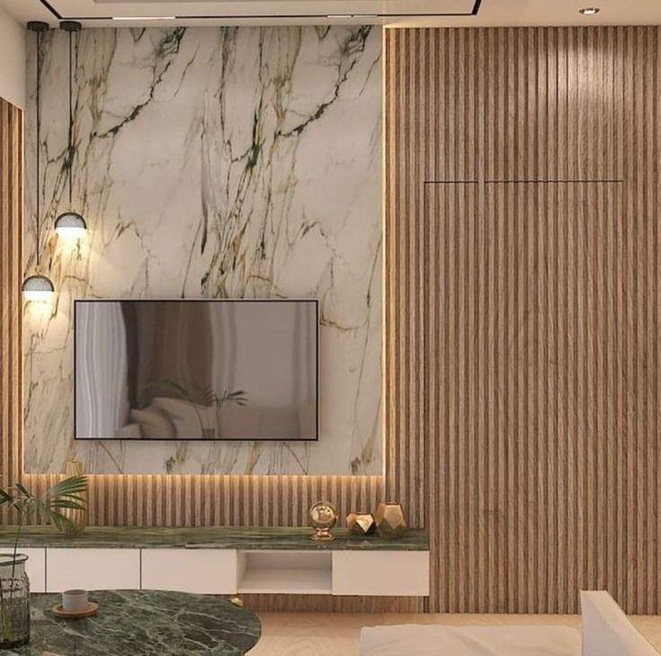 جدار رخام فاخر مع خشب وإضاءة LED